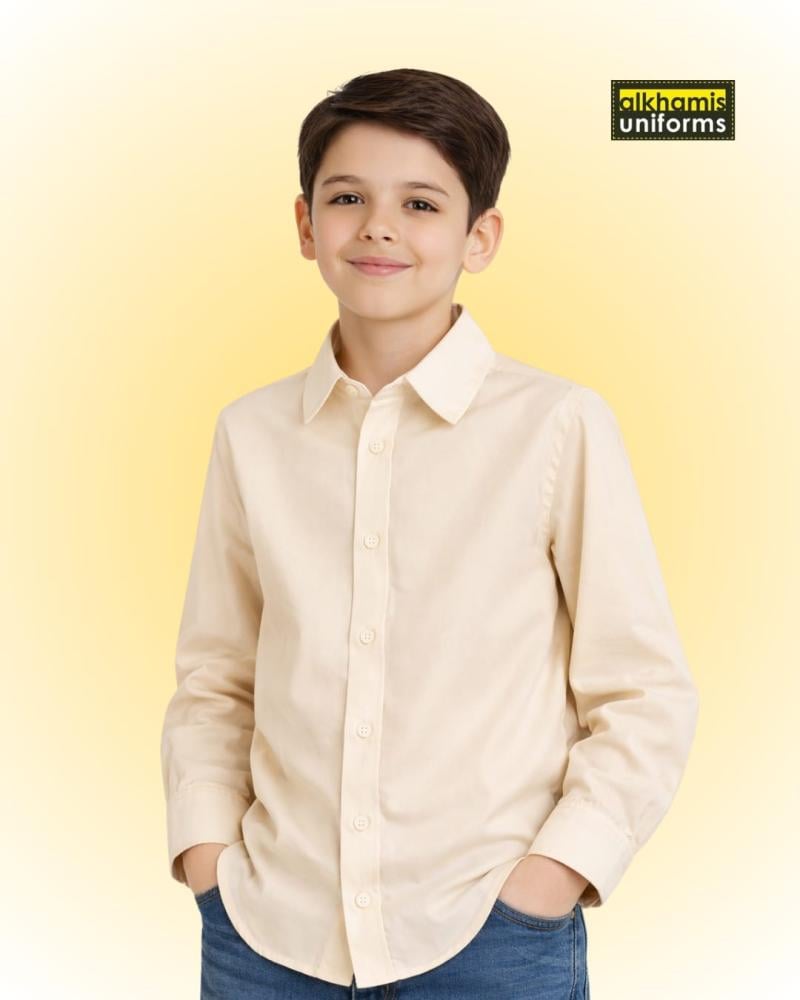 قميص بيج ولادي بأكمام طويلة و ياقة مثلثمريح و أنيق وسهل بالحركةيتناسب مع الاعمار من ( سنتين الى 8 سنوات)سهل في الكي